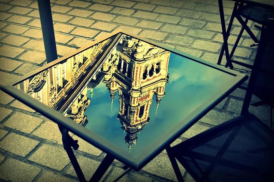 當你使用帶邊框的反射面(如鏡子、光滑桌面、眼鏡)或體積很有限的反射面(如小水坑)時,會形成類似框架式構圖的效果,讓反射倒影部分變得頗為“吸睛”。