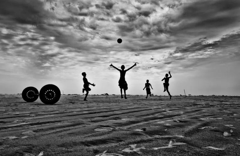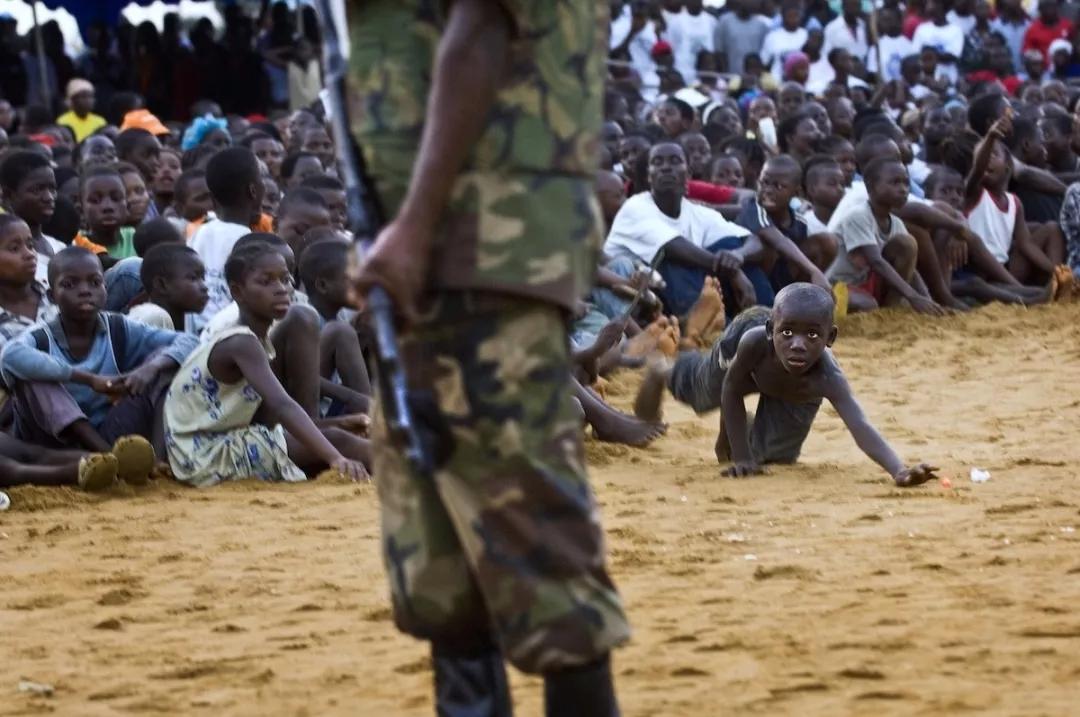 當他把鏡頭對準其中一名士兵的時候,在圍觀的人群中突然間鉆出來一個小男孩,試圖撿回他掉出去的球。利比里亞經歷了多年的內戰,這個小男孩在戰爭中長大,他本能地害怕士兵和他們手中的槍。他想要把自己寶貴的球撿回來,然而他的眼睛卻一直緊緊盯著前面的士兵。