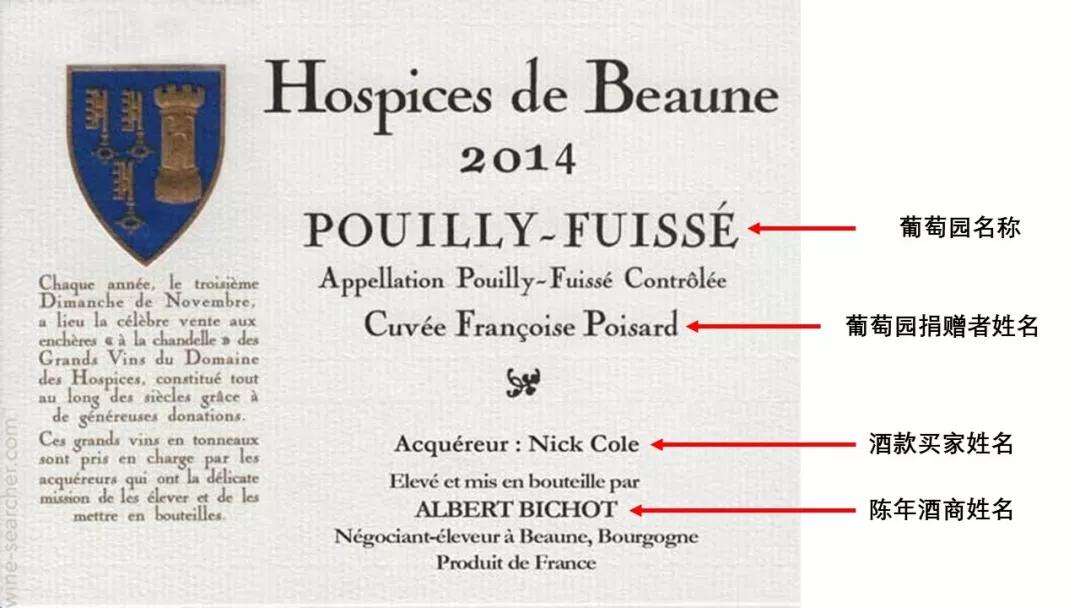 以下圖酒款為例,酒款產(chǎn)自Pouilly-Fuissé,葡萄園捐贈(zèng)者為Fran?oise Poisard,買家為Nick Cole,陳釀酒商為Albert Bichot。