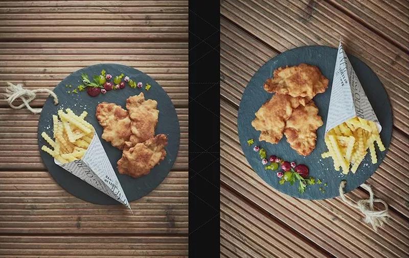 當(dāng)你發(fā)現(xiàn)背景中存在大量線條(或定向的紋路)時(shí),不妨嘗試改變一下食物擺放和拍攝的角度,讓背景的線條變傾斜,或許會(huì)有意外之喜。