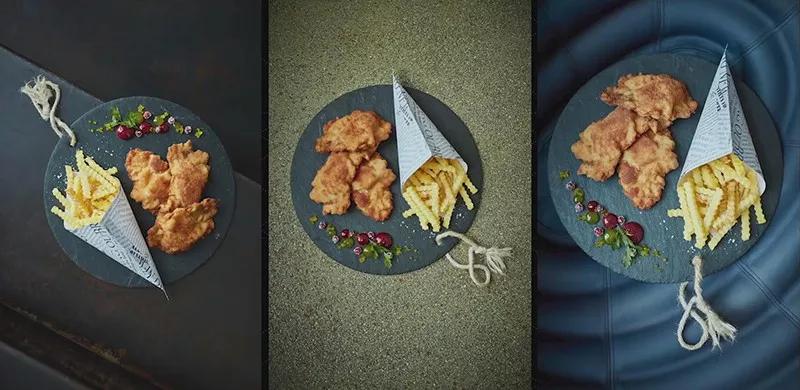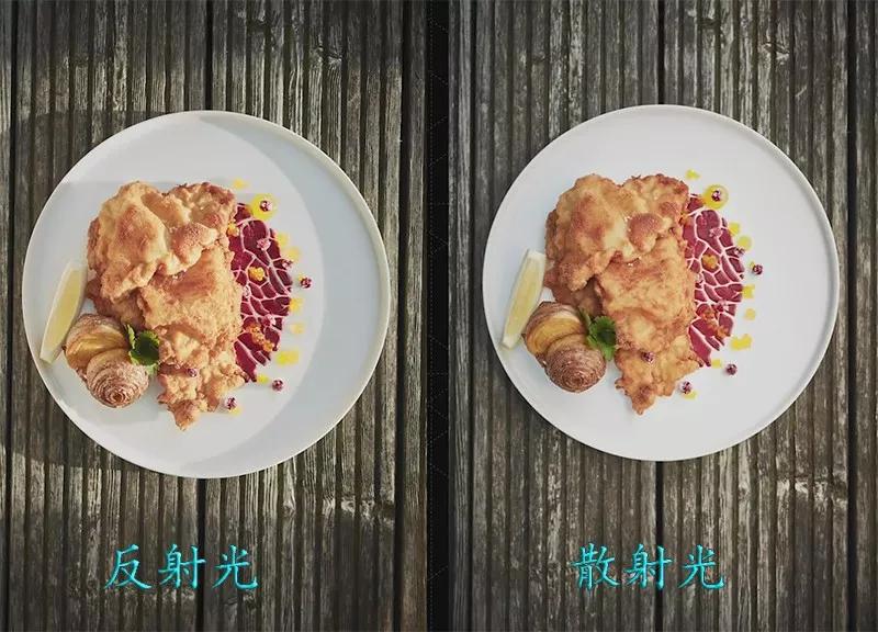 你可以用反光板引導(dǎo)光線,直接從側(cè)面照在主體上,這樣會(huì)有一種“自然”的氛圍;你也可以用柔光板“過濾”光線(或者把菜品放在靠近光照區(qū)域的陰影處)來獲取散射光,這樣的光線會(huì)更“柔”,產(chǎn)生的陰影更少。