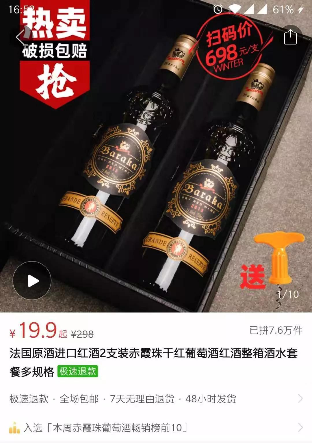 主打“下沉”市場的拼夕夕,“葡萄酒”品類熱銷7.5萬件的是19.9元2瓶還送皮盒的灌裝酒。但凡有葡萄酒常識的消費者都能想到,除掉包裝、物流、人工,還能有毛利,得是多么劣質的酒液,才能做出不到10塊錢的售價。