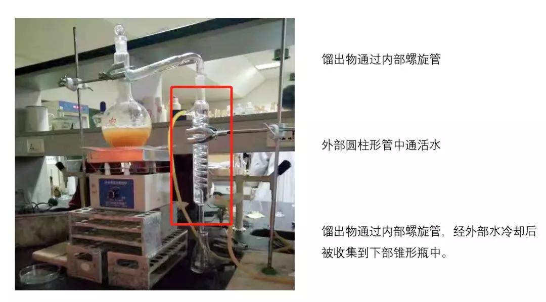 ▲ 筆者讀書時在實驗室搭建的簡單蒸餾裝置,紅色框線框出裝置為冷凝管,大家湊合看。