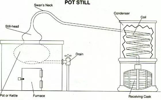壺式蒸餾器是最古老的蒸餾器,結構也相對簡單。由于壺式蒸餾器每次僅能少量提高酒精度,因此在蒸餾時須采用分批蒸餾法才能保證得到足夠的酒精度。且每次蒸餾前,必須清理蒸餾器后才可重新裝入酒液進行下一次蒸餾。