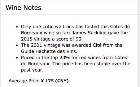 Chateau Lafitte酒莊位于位于法國C?tes de Bordeaux產區,由Raymond Lafitte創建于1763年。在Wine Searcher上的國際均價為175元,James Suckling曾為其2015年份的葡萄酒打了90分。