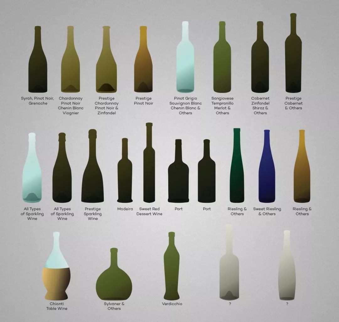 在這個統一的設計理念下,不同產區的不同瓶形,有一些是實用的區別——比如香檳格外厚重堅固的瓶子是因為瓶里壓力高達6個大氣壓。大部分其實都是因為傳統——當初設計瓶子時就是這個形狀,沒有什么理由。后來也再沒改過。