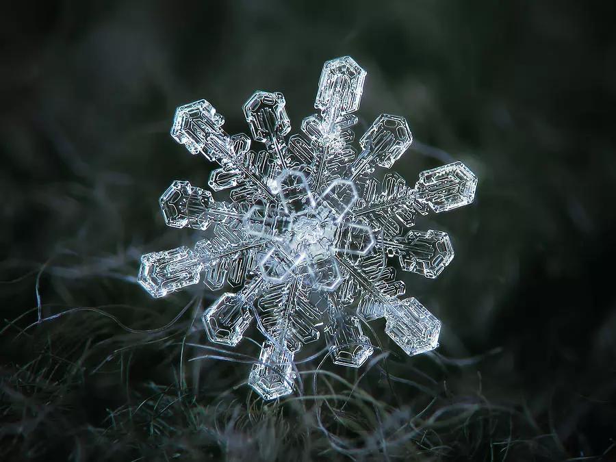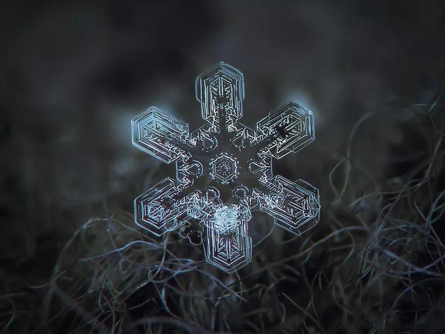 在他的微距鏡頭下,紛紛揚揚的一場場雪被“拆碎”,形態(tài)各異的冰晶呈現(xiàn)出各式形狀規(guī)整、樣式精美的圖案,在讓人沉迷于雪花無限美麗與夢幻的同時,亦讓人不禁贊嘆大自然的神奇。