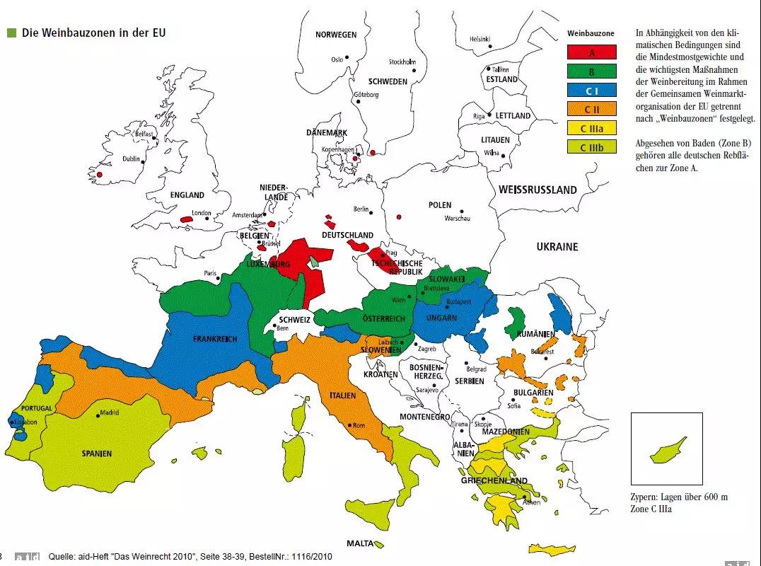 上眼看這張歐盟27國葡萄酒產區劃分圖(依據氣候)。