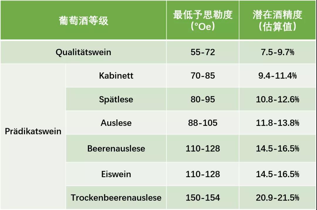 1971年,德國頒布了一套葡萄酒分級法規:葡萄采收時成熟度(最低含糖量,以予思勒度°Oe)越高,對應葡萄酒的等級就越高。