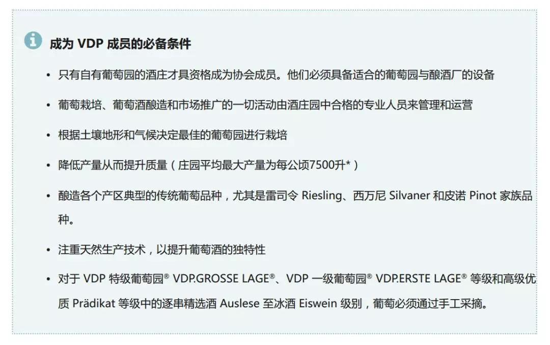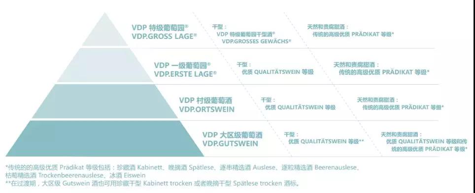 VDP聯盟規定,無論采收時最低糖含量為多少,只要做成干型,則統一降級到Qualit?tswein級別。