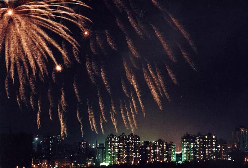 建議大家可以選擇在高處進行拍攝,因為可以避免一些不必要的前景,同時也可以將城市的景色納入畫面中。另外,拍攝地點盡量選擇在煙花燃放的側方或者是風的前方,如果站在下風口,燃放煙花的灰塵和煙霧會讓你受不了。