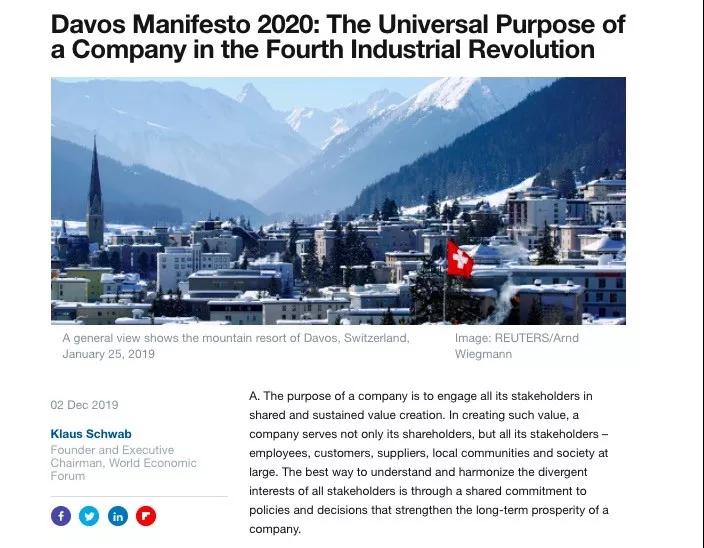剛剛發布的2020年《達沃斯宣言》寫道:企業不僅要為股東,也要為所有利益相關者(員工、客戶、供應商、當地社區和整個社會)服務。在細則中,“為客戶服務”是第一條,“為股東提供投資回報”則被放在最后一條。