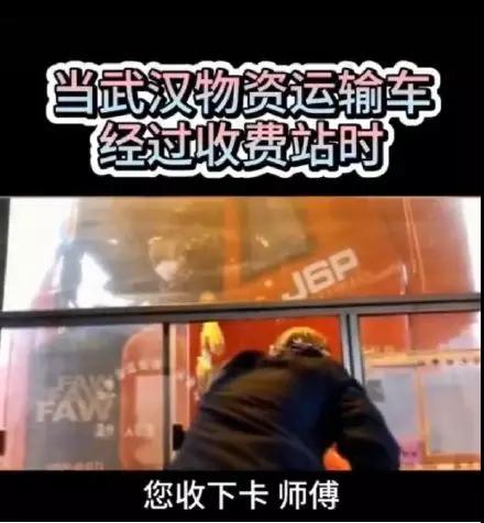 一輛武漢物資運輸車經(jīng)過收費站。工作人員把卡給了司機師傅,起身敬禮:您辛苦了,武漢加油,中國加油!