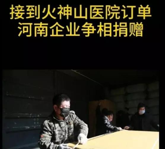 大年初五,河南洛陽一家家居廠,接到了一筆20萬元的醫(yī)療柜訂單。老板袁先生定睛一看,原來是武漢火神山醫(yī)院要用的。他立刻接單,并回復:“不用買,我們免費捐贈!”由于自家儲備不足,袁先生把這個消息發(fā)到了當?shù)丶揖邊f(xié)會的群里。協(xié)會的人看到消息后,競相捐贈。14家企業(yè)連夜加班,一夜之間就湊齊了訂單。