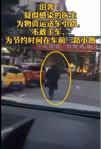 救援物資運送車到了醫(yī)院附近。一位醫(yī)生跑過來引路,但他不敢上車。他說:“我現(xiàn)在疑似感染,就在車外給你們引路吧!”然后他跑在車前,把車帶向指定地點。