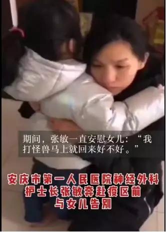 大年初二,安慶市第一人民醫(yī)院副護士長張敏,要奔赴疫區(qū)了。行前,女兒抱住她,哭著不讓媽媽走。護士長忍住淚水,告訴女兒:“媽媽要去打怪獸了,很快就回來……”