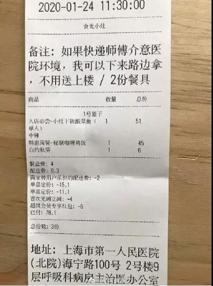 大年三十中午,上海市第一人民醫(yī)院呼吸科的醫(yī)生點了兩份外賣。疫情當前,下單的醫(yī)生體貼地備注: