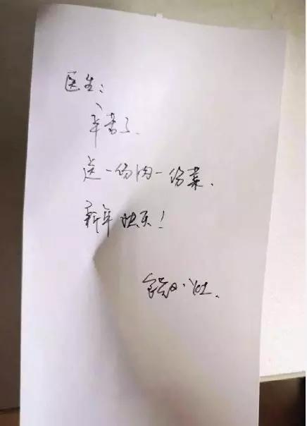 半小時后。快遞小哥不僅把飯菜送上了二樓,店家還免費送了兩個菜,并附了一張字條:“醫(yī)生:辛苦了。送一份肉一份菜。新年快樂!”