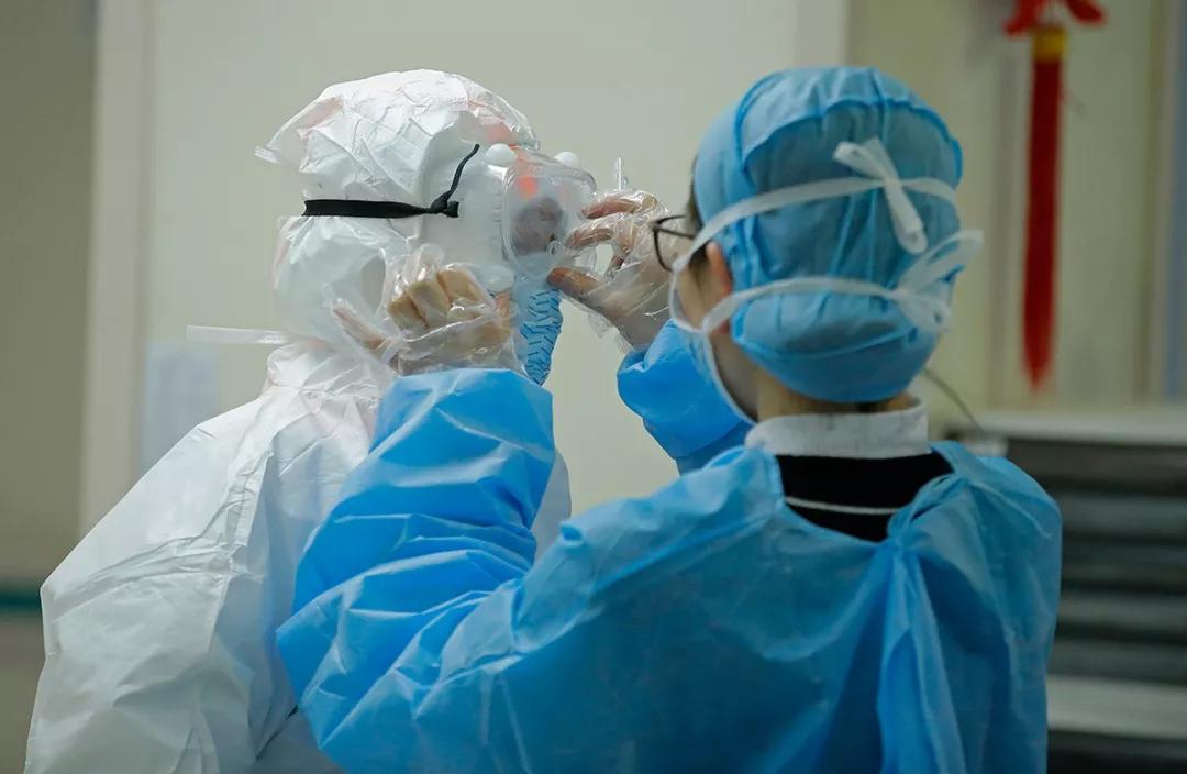 由于防護服一人穿起來很麻煩,一位護士讓別人幫忙調整目鏡。