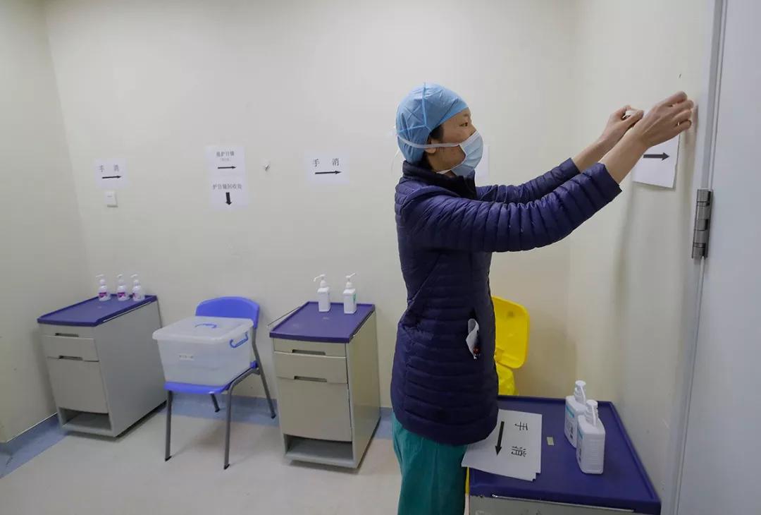 武漢協和醫院西院新冠病房開始投用前一小時,醫護人員在半污染區做最后的準備。
