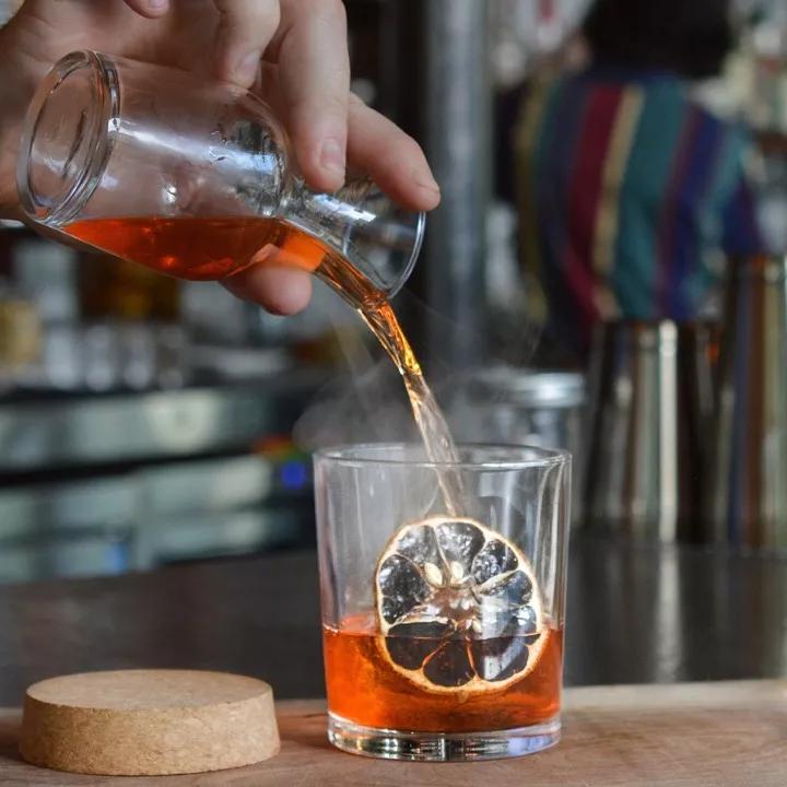 老板Logan Thies說:“煙熏冰中的水慢慢在雞尾酒中融合,煙熏味逐漸突出。”Aperol開胃酒取代了橙皮,散發(fā)出香橙味;柑橘油呈現(xiàn)出美妙的明亮色調(diào);但我希望它更清晰更復(fù)雜,但又保持真實和自然。”
