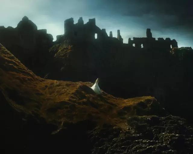 婚紗照數量龐大,要想拍出絕對的新意很難了,但在美感上,留給攝影師的空間還是很多的。像下圖這張作品,一方面利用了富有詩意的側光來刻畫人物,表現山坡上植被的唯美色調;另一方面則突出表現了古堡的剪影,勾勒出偵探電影般的幽深氛圍。