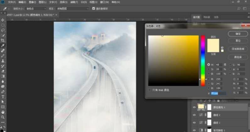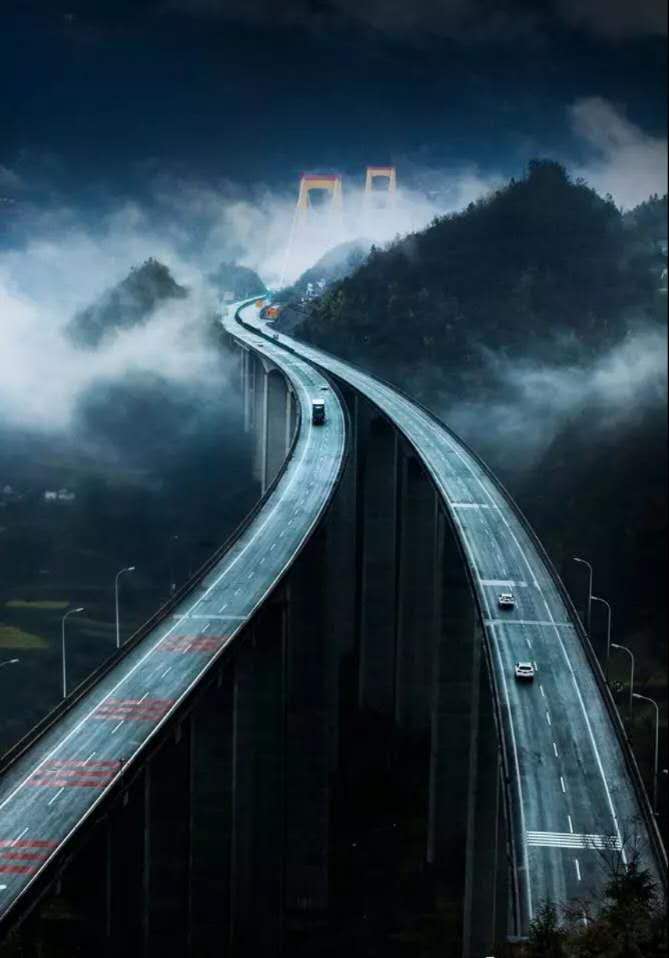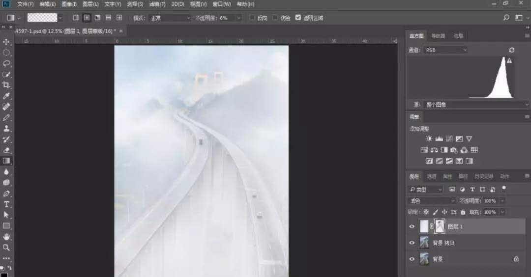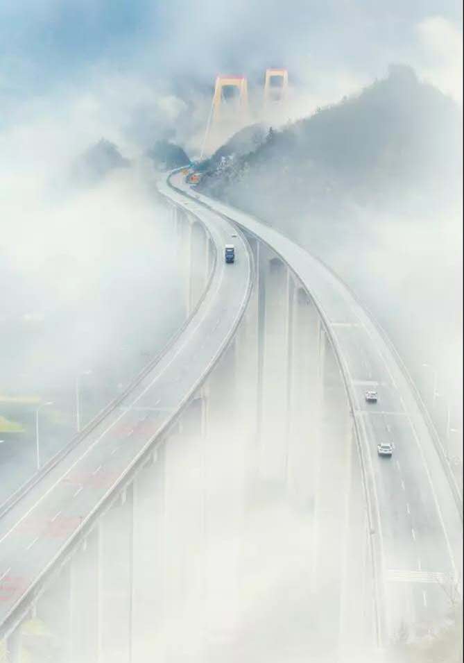 對原圖作適當(dāng)?shù)牟眉簦巩嬅娓雍啙崱S镁匦翁姿鞴ぞ哌x取部分云霧,通過自由變換覆蓋整個畫面,選擇濾鏡-模糊-高斯模糊,對新圖層進行模糊處理,使云霧更自然,選擇圖層混合模式為濾色,并為該圖層建立蒙版,點擊“漸變工具”,選擇從前景色黑到背景色白的漸變,再選擇“徑向漸變”,前景色為黑色,用不透明度8%左右,編輯蒙板,擦出高架橋的部分,最后對該蒙版作適當(dāng)?shù)挠鸹?/span>