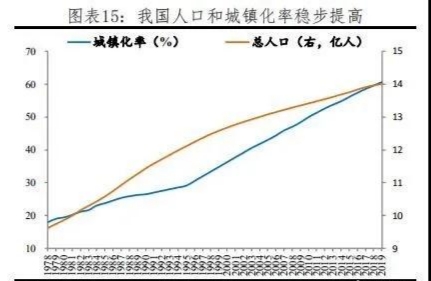 2019年城鎮(zhèn)化率達60.60%,比上年末提高1.02個百分點,保持穩(wěn)步增長態(tài)勢,較高收入經(jīng)濟體的81.3%仍有20個百分點的空間。過去四十年,中國城鎮(zhèn)常住人口從1.7億快速增至8.5億,凈增加6.8億,城鎮(zhèn)化率從17.9%提升至60.6%,提高43個百分點,深刻地改變了中國經(jīng)濟社會格局,成就了過去中國重化工業(yè)、大規(guī)?;A設施投資、房地產、消費升級等的飛速發(fā)展。