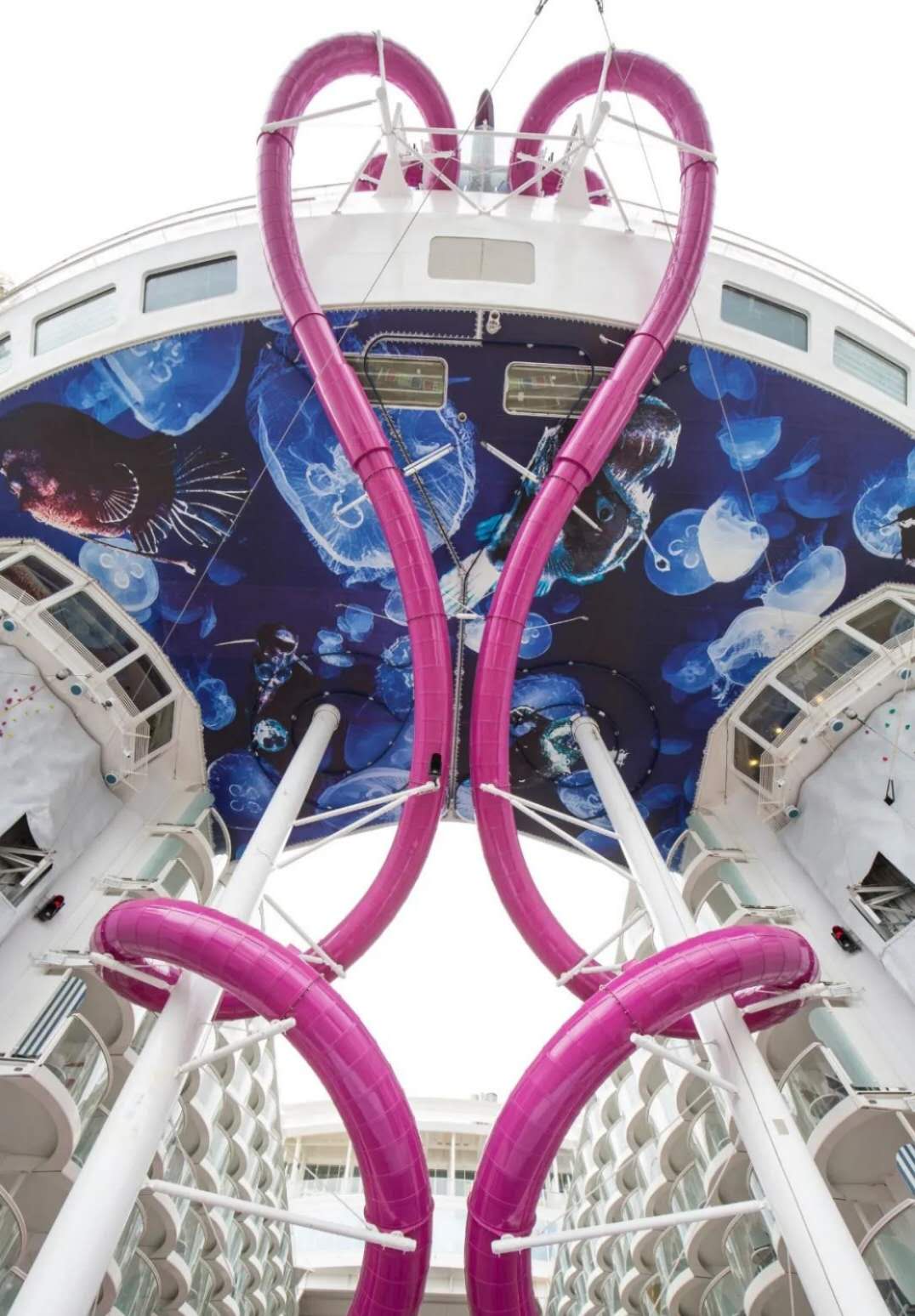 在海洋和諧號(hào)郵輪上,皇家加勒比首次出現(xiàn)的.終極深淵水上滑梯,游客可以從一個(gè)玻璃平臺(tái)上出發(fā),以每小時(shí)9英里的速度從10層甲板上滑下。提供一種多感官通道的滑梯體驗(yàn),包括自發(fā)的音響效果、定制的騎行墊、定制的制服和配件。該景點(diǎn)旨在刺激客人,同時(shí)保持一種心跳的期待感。終極深淵位于海之和諧號(hào)的尾部,高出海平面150英尺,有100英尺的落差。