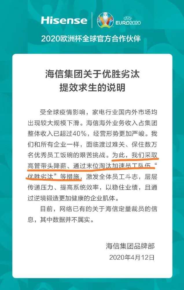 海信集團采取高管帶頭降薪、通過末位淘汰加速員工隊伍“優勝劣汰”等措施,激發全體員工斗志,層層傳遞壓力、提高系統效率,以穩住業績,且通過逆境鍛造更加健康的企業肌體?!?br />