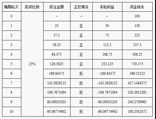 計(jì)算后每次下注比例為當(dāng)時(shí)總資金的25%,這樣就能獲得最大收益。
