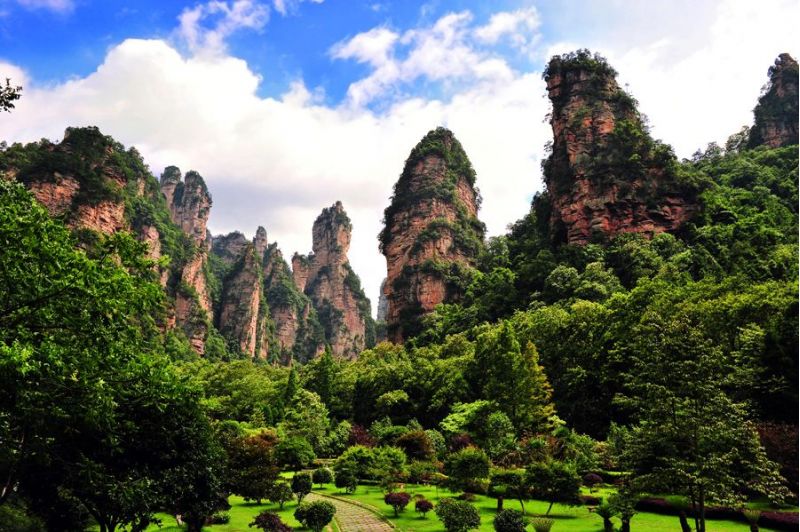 張家界國家森林公園自然風光以峰稱奇、以谷顯幽、以林見秀。其間有奇峰3000多座,如人如獸、如器如物,形象逼真,氣勢壯觀,有“三千奇峰,八百秀水”之美稱,主要游覽景點有:黃石寨、金鞭溪、袁家界、楊家界、天子山和十里畫廊等精華景點。