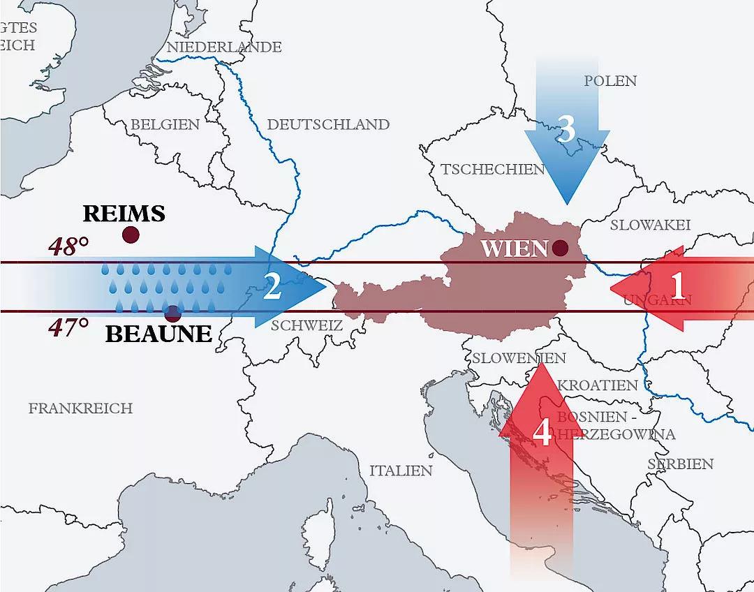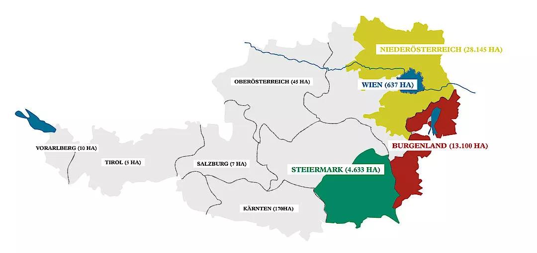 奧地利位于歐洲腹地,西部與南部被阿爾卑斯山脈覆蓋,葡萄酒產區集中在東部地區。
