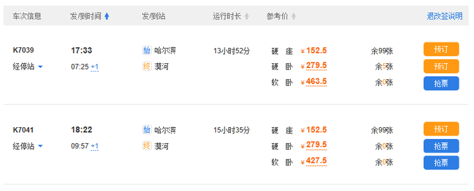 哈爾濱-漠河列車(chē)時(shí)刻表