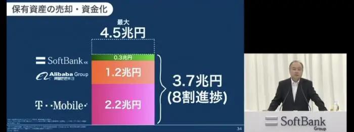 6月23日,軟銀宣布了另一筆融資計劃,將出售1.98億股美國第三大電信商T-Mobile的股份,價值高達210億美元,相當于其持有的T-Mobile的三分之二的股份。在6月25日的股東大會上,孫正義表示上述達4.5萬億日元資產出售計劃已完成了80%,將繼續探索剩余20%的籌資計劃,但并未具體展開。