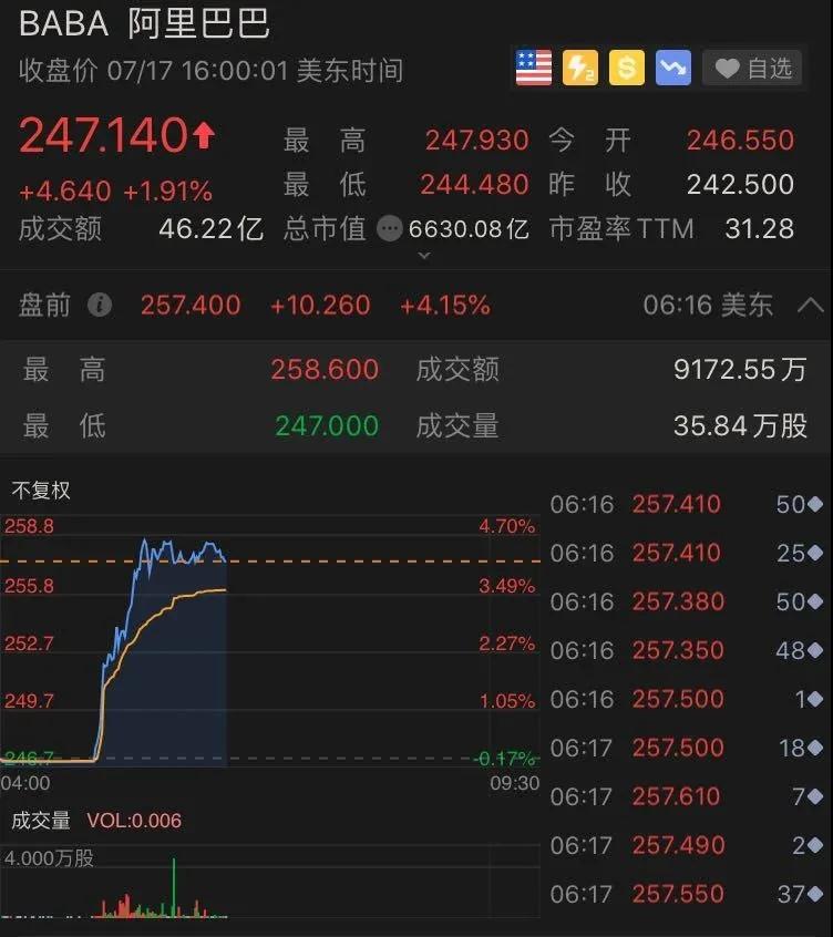 受此消息推動,阿里巴巴美股盤前迅速拉升,截至發稿,漲4.15%,報257.40美元。