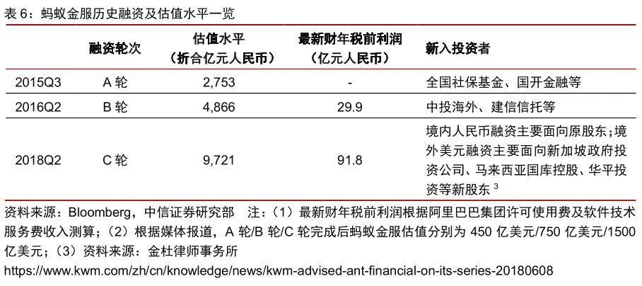 2015年、2016年、2018年,螞蟻集團分別完成A輪(約18.5億美元)、B輪(約45億美元)和C輪(約140億美元)融資。根據媒體報道,螞蟻金服在2018年6月完成C輪融資后的估值水平約為1500億美元,折合人民幣約萬億。