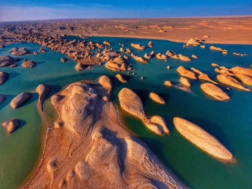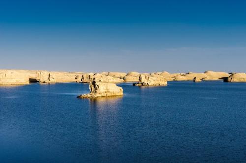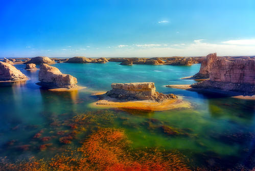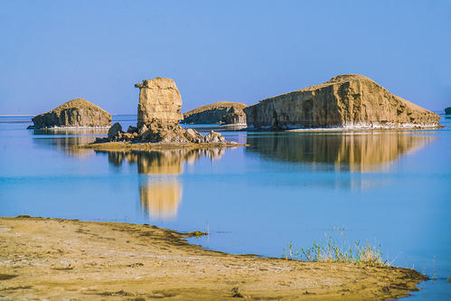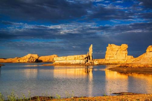 【水上雅丹】是世界上唯一一處水上雅丹地貌,因其位置較偏僻,即使是當地人也可能不知怎么過去,所以至今仍是一片未開發的處女地,鮮少有人涉足。這立于汪洋之上的雅丹地貌群經過上千年的風雨殘蝕,如同遨游大海顯露脊背的群鯨,湖岸邊高大的鯨背是天然的觀景臺,極目遠望,西邊是高低錯落的水上雅丹地貌群,有的如策馬揚鞭,有的如奔馳的駱駝,有的像婀娜多姿的女子,魔幻而神秘。以清澈透明的藍天為幕,參差錯落的雅丹地貌與碧波交相輝映,天上鴨鳴雁啼,水中波光粼粼,這一望無際的荒漠中憑空而出了一片”汪洋“,只有親身看過這一片汪洋上的鬼斧神工之作,才會明白為它為什么會被人稱為“魔鬼城”。
