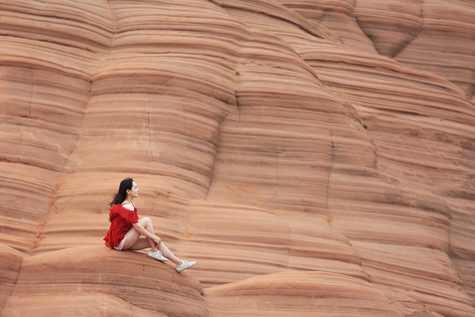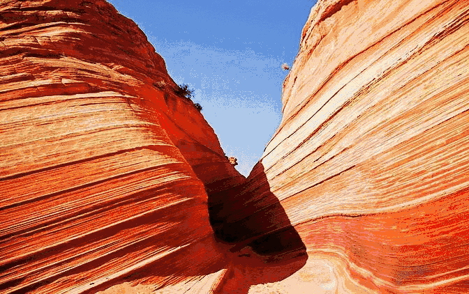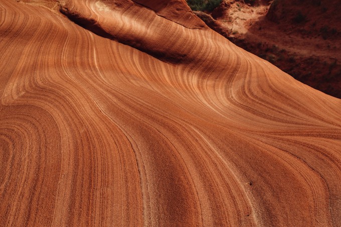 美西和陜北波浪谷,都是古老的沙丘隨著平原的上升,加上漫長的風蝕,水蝕,峽谷里砂巖的層次逐漸清晰地呈現(xiàn)出來。平滑的,雕塑感的砂巖和巖石上流暢的紋路創(chuàng)造了一種令人目眩的三維立體效果。二者也有一定區(qū)別,美西波浪谷在紅色之間夾有白色線條,紅白相間;而陜北波浪谷則以紅色為主。