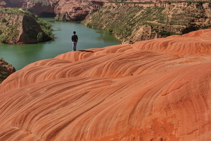 波浪谷景區(qū)位于陜西省靖邊縣城東南22公里處的龍洲鎮(zhèn),是典型的盆地型峽谷,這里紅巖環(huán)繞,綠水縈繞,方圓百公里都被紅色砂巖所覆蓋,與美國亞利桑那州的波浪谷非常相似, 亞利桑那州波浪谷紅色之間夾有白色線條, 靖邊波浪谷則以紅色為主。