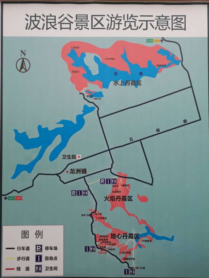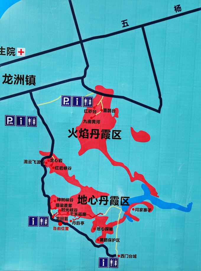 景區(qū)是很大一片區(qū)域,分為水上丹霞區(qū)、火焰丹霞區(qū)、地心丹霞區(qū)三個部分。路標指示不明確,只有“水上丹霞區(qū)”和“火焰丹霞區(qū)”兩個地方的標識,具體需要自行找路。根據當?shù)厝私榻B,整個景區(qū)有1、2、3、4、5號五個景點,1至4號可以自行開車游覽,5號由于路況不好并且有十多公里路遠,需要花200元左右請當?shù)厝藥凡拍芮巴聢D是現(xiàn)場拍的景區(qū)示意圖,能很清晰的看出景區(qū)分布,供大家參考。