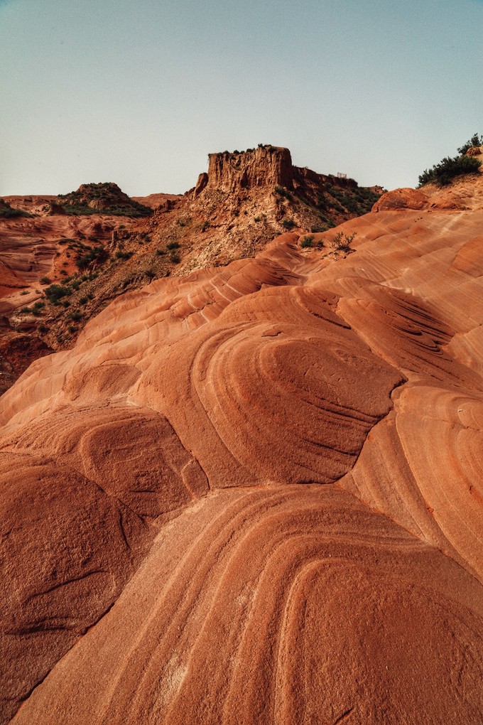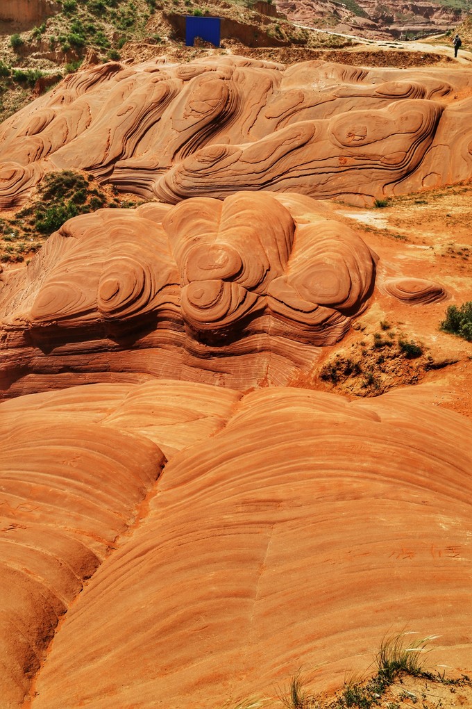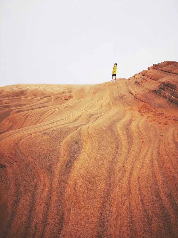 龍洲丹霞B景區(qū),目前命名火焰丹霞,也是最類似美西波浪谷的地方,這里向我們展示了由數(shù)百萬年的風、水和時間雕琢砂巖而成的奇妙世界。深深的溝壑里,千百年雨水沖刷成各種各樣奇特的線條,形狀如波浪、獸首、流水、云朵....展示著風采神韻、萬千姿態(tài)、四季景色各異。