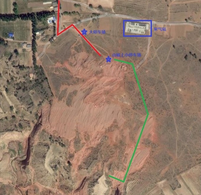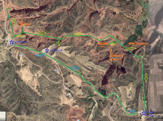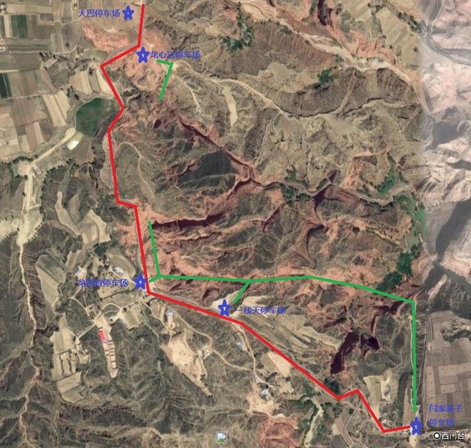 紅線為行車路線,綠色為步行路線,藍星為停車場。純正原創(chuàng),僅供參考。