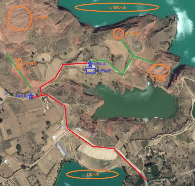 在龍州鎮(zhèn)北邊有幾處明顯的“水上丹霞”指示牌指向水上丹霞,過土橋水庫向前幾百米,A停車場就在路邊,停車前行就可以看見被圍欄圍起來的一片丹霞。B停車場設在當?shù)匾粦艮r民的院內,右手有一個農民自己修建的岔路,進去一兩百米就是了。