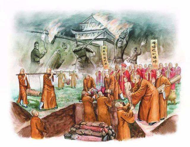 后來,太武帝聽取三朝元老崔浩的建議,改信寇謙之創立的天師道教,開始徹底排斥佛教。也是倒霉,長安的一所寺廟后來牽連到蓋吳起義之中,太武帝大怒,加上崔浩的推波助瀾,正式開啟了大規模的滅佛行動:長安幾乎所有的沙門中人被誅殺,北魏全國的經文、佛像和寺廟被焚毀。