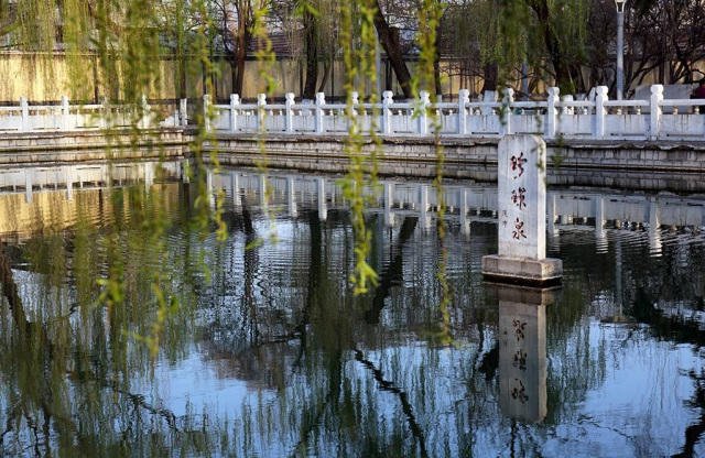 珍珠泉,坐落在院前街山東省人大常委會大院內西側,略成長方形,面積1240余平方米,深廣清澈。因舊城東南隅護城河中有南珍珠泉,所以該泉又稱北珍珠泉。金《名泉碑》、明《七十二泉詩》、清《七十二泉記》均著錄。泉池溢水標高26.28米。珍珠泉泉水由玉帶河北流進濯纓湖,經百花洲注入大明湖。珍珠泉自古以來頗負盛名,歷代多有文人題詠。