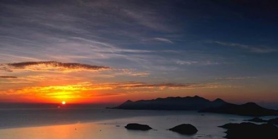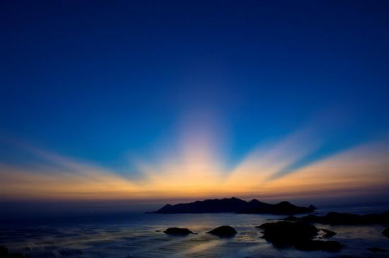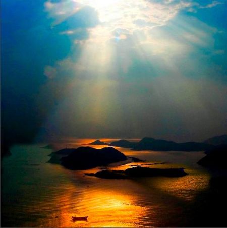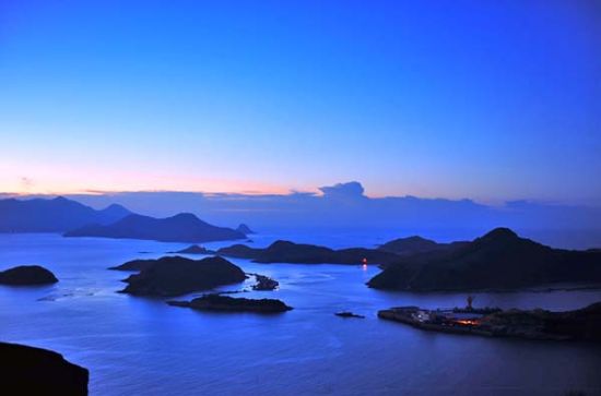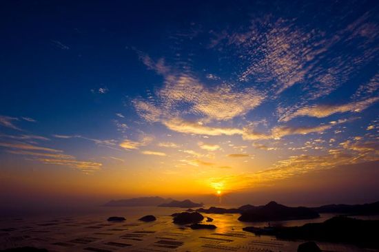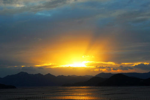 花竹是攝影者眼中的圣地。站在觀景臺,居高臨下,眼睛所及是海的遼闊,山的壯美。開始,天空是純凈的藍色,中間一道金色的光帶把天和海分隔開來;漸漸地,金色的光帶暈染開來,越抹越寬。最后,太陽積蓄了他所有的力量,騰地一下躍出了海面。頓時,萬丈霞光,給天空披上七彩霓裳。陽光灑在海面,海水變成金黃色,艷得耀目。