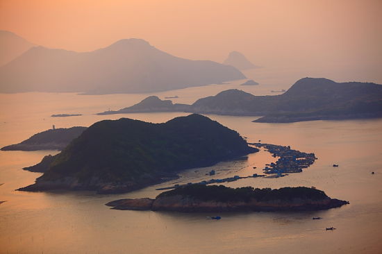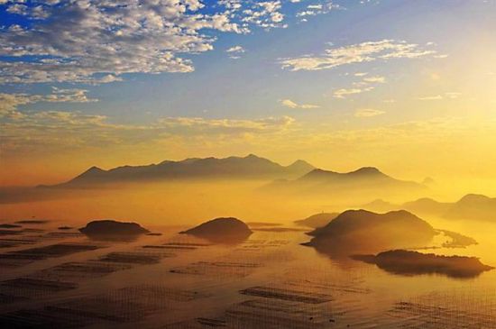 花竹村居高臨下、水天相連,有著一望無際的景深。近景浮標竹竿、中景魚排木屋、遠景島嶼帆影,整個場景井然有序。花竹還是觀賞“福瑤列島”全景的最佳地點,尤其以日出最為壯美。若適逢云霧漂浮之日,海面上云蒸霧涌、輕盈柔美。福瑤列島若隱若現,猶如海市蜃樓般迷人。