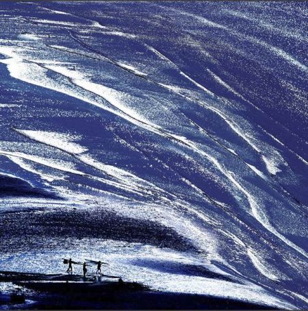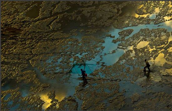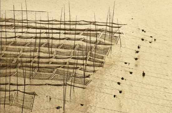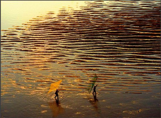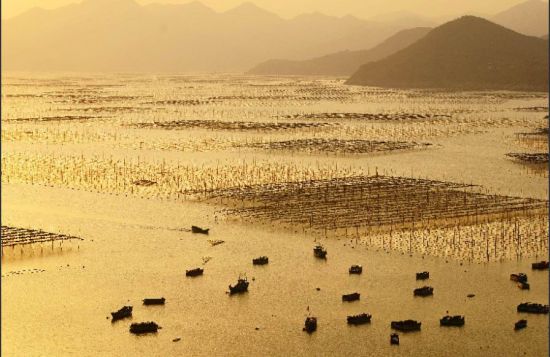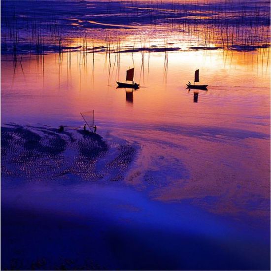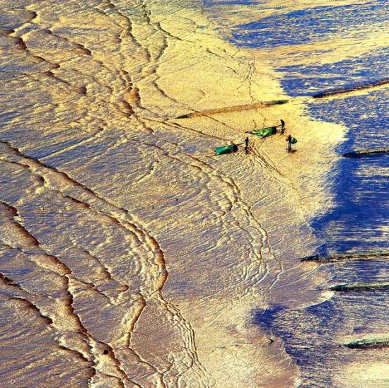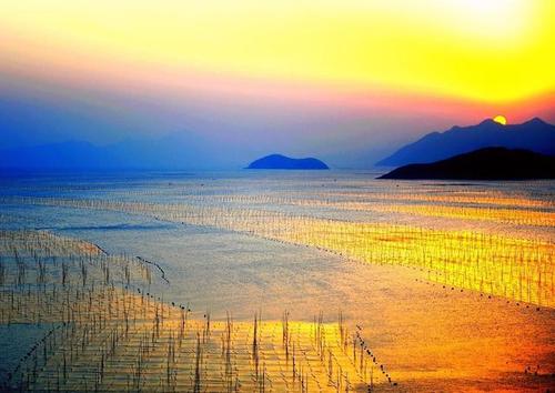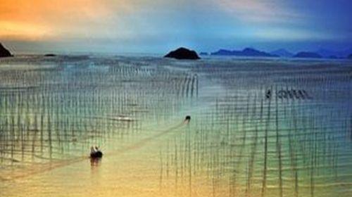 北岐是拍攝霞浦灘涂最精彩的一個拍攝景點,距城關只有五公里。這里最有名的是虎皮樣的灘涂斑紋和滿灘滿海的竿影、人影和船影。漲潮時海上忙碌的船只穿梭在浮標竿影(紫菜架)之間,與波光鱗鱗的大海、遠山、島嶼渾然一體,尉為壯觀。退潮時海灘的紋理漸顯秀質,勞作的漁民游動在虎皮灘上,使得這片灘涂更具韻律美和動態美。此刻無論從哪個角度觀賞拍攝,取景框里都無法抗拒那些由光影變幻組合而成的五彩灘涂的誘惑力,這就是北岐灘涂吸引一批又一批國內外圓眼大師為之折腰為之傾倒的魅力所在,是攝影人一生必拍的好景點。