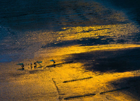 小皓海灘風光也是灘涂風光最經典的拍攝點,主要拍攝順、逆光沙質灘涂和海上種養、撈魚苗等勞作場面。小皓以沙質灘涂為主,順光能看到山下那一塊塊巨大的金黃灘涂隨波而變,逆光觀賞,一條條從沙灘上流淌過的溪水,化做蜿蜓曲折的灘涂動脈,閃爍著迷人的銀色光芒。